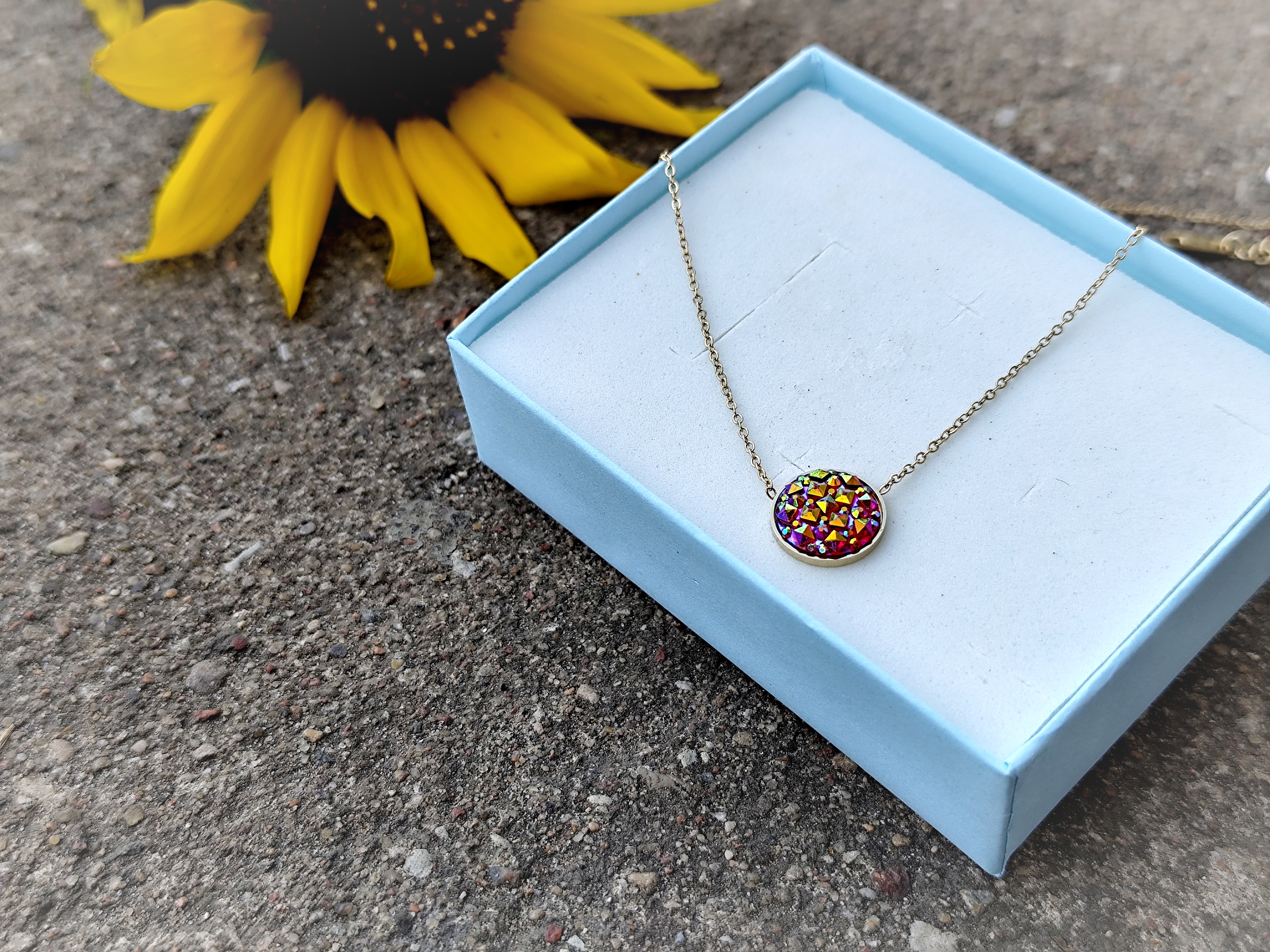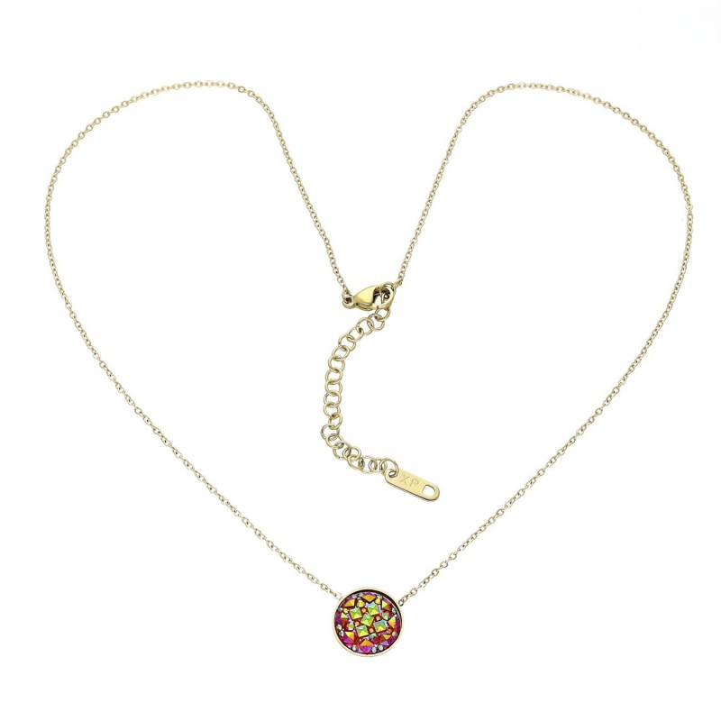 💖 Ten naszyjnik to połączenie subtelnej elegancji i dziewczęcego uroku. Wykonany z wysokiej jakości stali chirurgicznej w kolorze złota, zachwyca trwałością i odpornością na codzienne noszenie. Centralnym punktem jest delikatna zawieszka mieniąca się pięknymi kolorami.